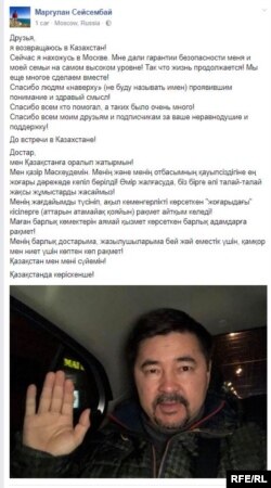 Біршама уақыттан бері шетелде жүрген Марғұлан Сейсембаев ақпанның 1-і күні Facebook әлеуметтік желісіндегі парағында өзінің Мәскеу әуежайында екенін, өзіне "жоғары деңгейде кепілдік" берілген соң Қазақстанға қайтып оралатыны туралы жариялаған.