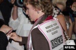 "Голос Республики" газетінің бас редакторы Татьяна Трубачева "ЕҚЫҰ - қызғылт көзәйнекті шешіңіз!" плакатымен Еуразиялық Медиа Форумда. Алматы, 27 сәуір 2010 жыл.