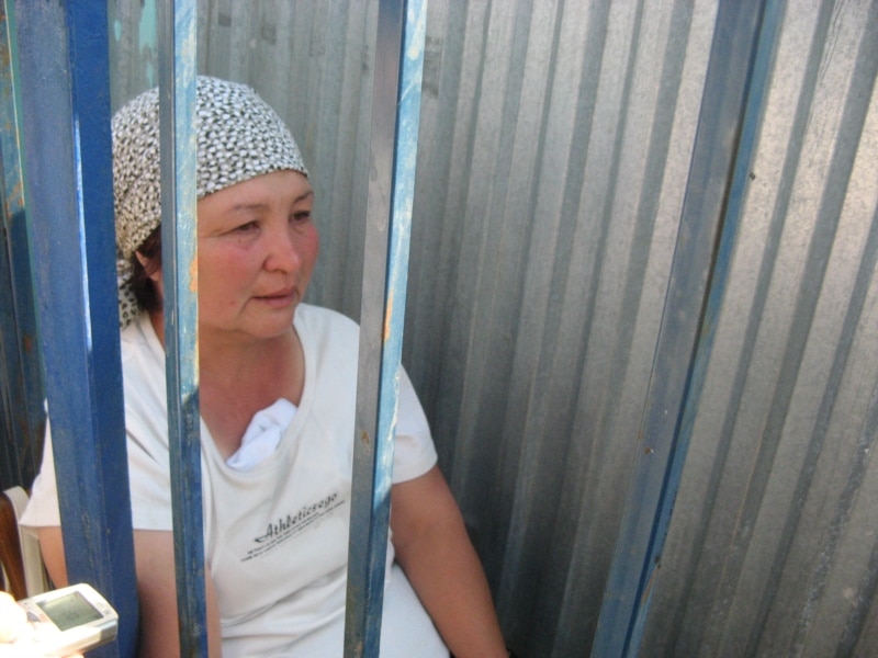 Шұбарши ауылының тұрғыны Айман Жұмағазина жауап алу үшін қамалған полиция бөлімшесі ауласында отыр. Ақтөбе облысы, Кеңқияқ ауылы. 1 шілде 2011 жыл.